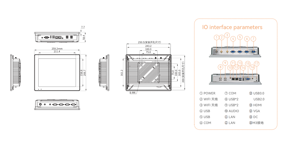| Resolution Ratio | 1024*768 | Overall Power Consumption | <17W (screen 3.5W) | Chassis material | Aluminum alloy structure |