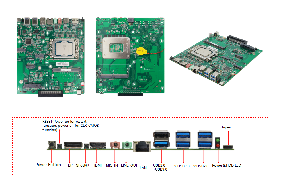 | CPU | Support Intel®12/13th CoRE ™ i7/i5/i3 Alder Lake &Raptor Lake Processor | I/O terminal display | 1 * Power Button 1 * RESET 1 * DP port 1 * Ghost key (reserved function) 1 * HDMI port 1 * MIC-IN port 1 * LINE OUT port 1 * LAN port 1 * USB2. O+USB3.0 port 2 * USB3.2 Gen2 port 2 * USB3.2 Gen2 port 1 * Power&HDD LED 1 * Type-C port (distinguished by model) 1 * OPS-C port 1 * DC port |